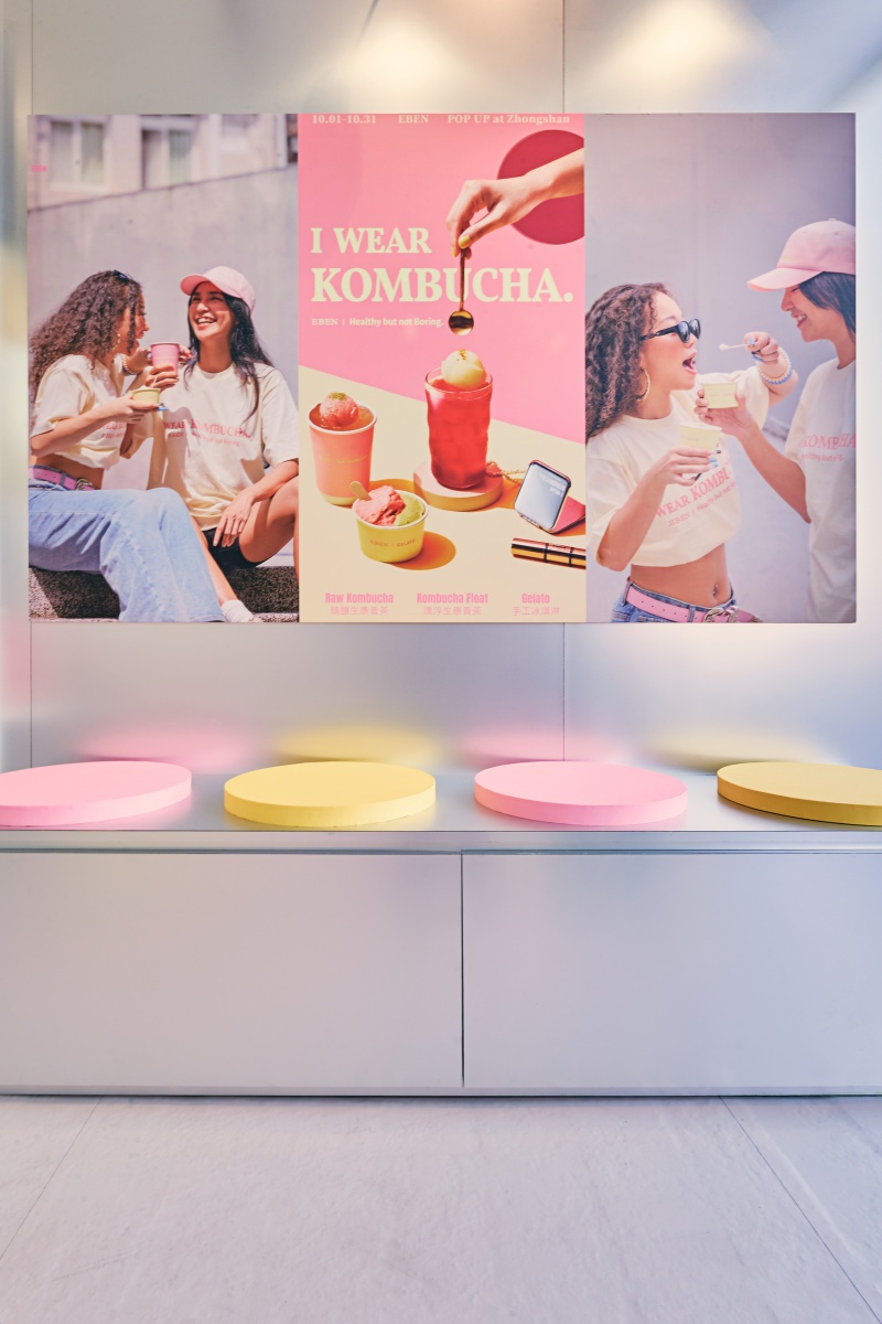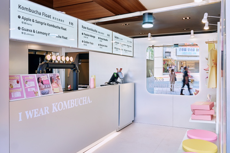 這次快閃店空間更是品牌生活風格的展現,以時下潮流正夯的銀灰色簡約風配上淡粉、淡黃為基底設計,外觀是大片透明玻璃印上品牌Logo,讓人一走進現場就能感受到透亮的空氣感,正如康普茶本身一樣,輕鬆融入日常卻又帶來滿滿新鮮感。