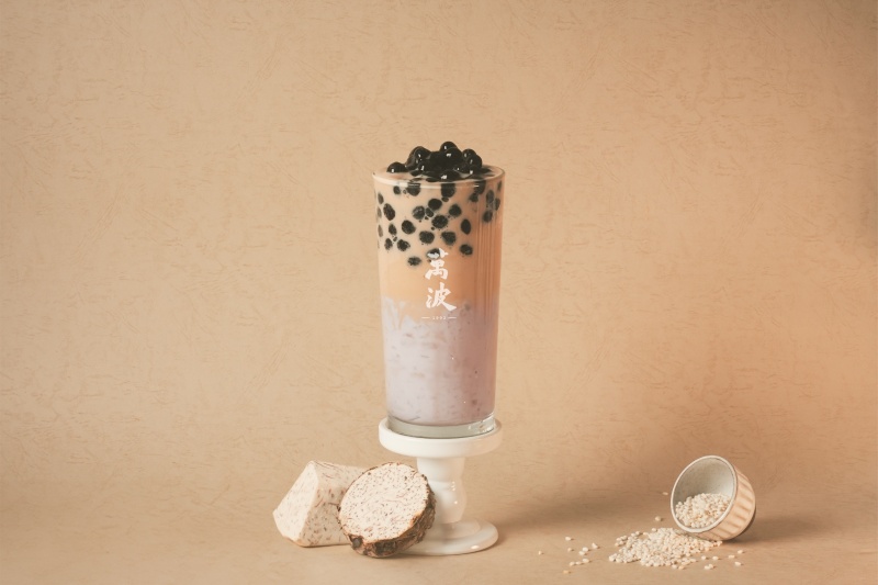 其中,全新飲品「米麻糬芋泥奶茶」 以萬波經典的島嶼紅茶與錫蘭紅茶雙茶調製奶茶為基底,