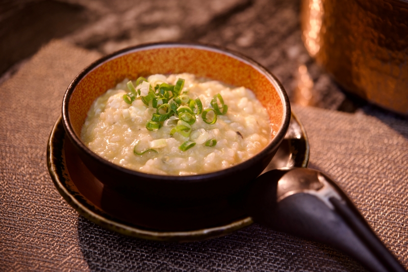 第五吃「帝王蟹膏粥」取蟹殼與蟹膏小火熬煮,米香與蟹香交織,為饗宴畫上溫柔句點。