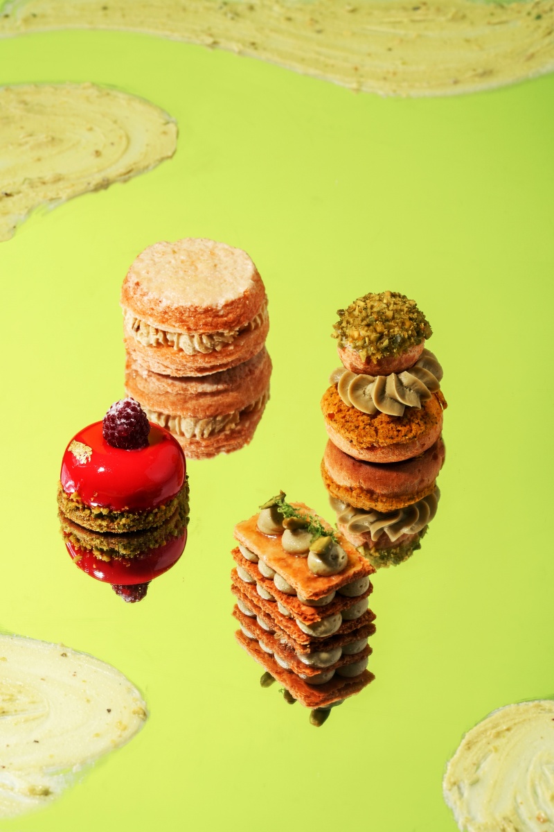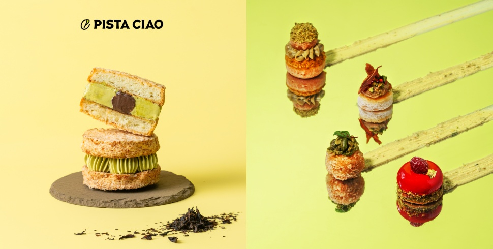 為完整呈現西西里開心果的奢華風貌,WOOBAR成為全台首個可入座享用PISTA CIAO的實體據點,將品牌之成熟大人系甜品、由法國雙藍帶主廚精心試煉研製的「焙茶開心果達克瓦茲」原封不動搬入合作下午茶套餐,蓬鬆餅皮散發淡雅杏仁香、外觀點綴珍珠狀糖霜,推薦於上餐時優先品嚐,享受特厚開心果與焙茶冰心內餡融於舌尖的絕妙體驗。而台北W飯店甜點專家──何玉梅則將開心果的獨特滋味結合多元食材與技法變化,推出以雙層結構展現精緻美學的「開心果白巧克力修女泡芙」,大顆泡芙包裹開心果香緹,表層佐以烏龍茶葉酥凸顯雅致香氣;小顆泡芙則填入白巧克力香草餡、頂端灑上開心果碎,再以開心果奶霜細膩銜接兩者。如珠寶般繽紛的「開心果草莓凍慕斯蛋糕」,基底為開心果杏仁蛋糕,乘載著中心夾入酸香草莓凍的馬斯卡彭乳酪慕斯,注入明亮果韻;外層以金箔與覆盆子果粒裝飾、包覆少女粉色系淋面,輕盈化口的質地交織滑順醇厚的層次。「開心果卡士達拿破崙派」的酥脆派皮裹上糖衣後烘焙,夾以濃郁的開心果卡士達、刨上少量檸檬絲解膩,演繹法式經典的優雅氣韻。