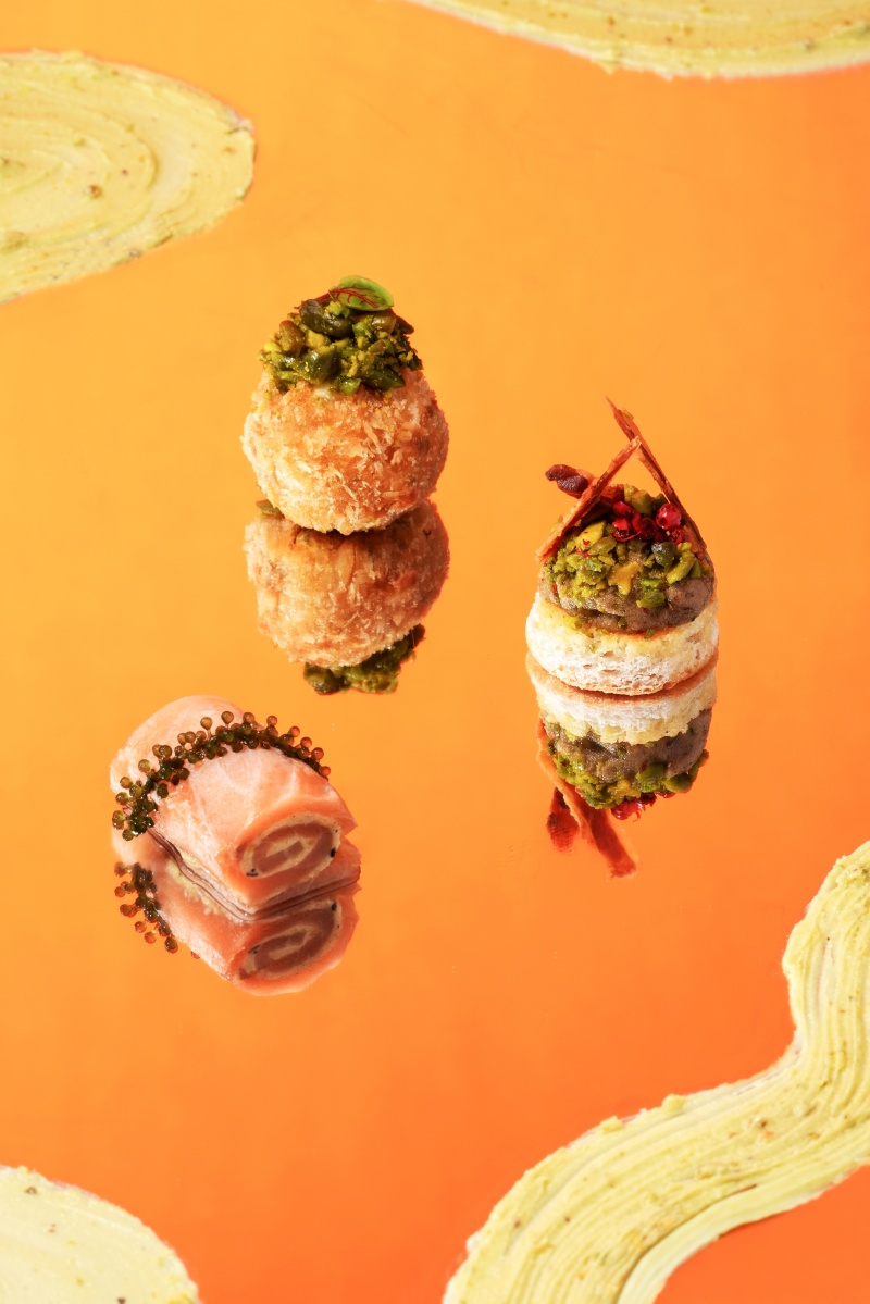開心果的百搭特色在鹹食上亦發揮得淋漓盡致,一口咬下「脆培根、巧克力開心果杏桃醬」,首先感受底部以澄清奶油香煎的瑪芬蛋糕,與頂層烤至酥脆的培根相呼應;中間配料除了開心果奶酥醬外,特別選用酸甜杏桃果乾、巧克力與椒鹽粉組成,調和甜醬與肉品的風味平衡,最後撒上紅胡椒碎妝點明豔色澤,綻放魅力風華。「酥炸墨西哥輕辣開心果奶油起司球」的金黃外衣下蘊藏驚喜,內餡凝聚奶油乳酪與墨西哥煙燻辣椒Chipotle的精髓、拌入小酸瓜丁增添爽脆,綿香微辣令人驚豔;主廚秘方特製焦糖開心果碎則盡顯堅果香,餘韻悠長。「松露開心果奶酥燻鮭捲」選用油脂豐富的炙燒燻鮭魚為主角,塗抹以松露美乃滋、普羅旺斯香料與開心果奶酥醬調配的抹醬後捲起,與頂端海葡萄的鹹鮮完美交融。