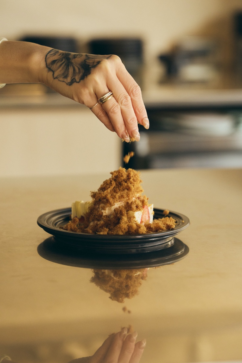 2022年隆重登場的「草肉2.0」——「白巧草莓肉鬆生乳酪」,不同於初代2017年以戚風蛋糕為基底,這款專為內用打造的「生乳酪」版本,展現了更深邃的風味層次。以依思尼白乳酪構築起純淨架構,在醇厚奶香的低吟中,優雅帶出台灣草莓鮮美誘人的旋律。香甜脆口的白巧克力塔底,與刻意不完全混合的草莓鮮奶油交織成一首關於爽脆與綿密的感官協奏曲,最後灑上的來自老牌肉乾名店「金龍肉乾創始店」的鹹香肉鬆,這番鹹甜交織的絕妙滋味,讓人只想在舌尖不斷循環播放。