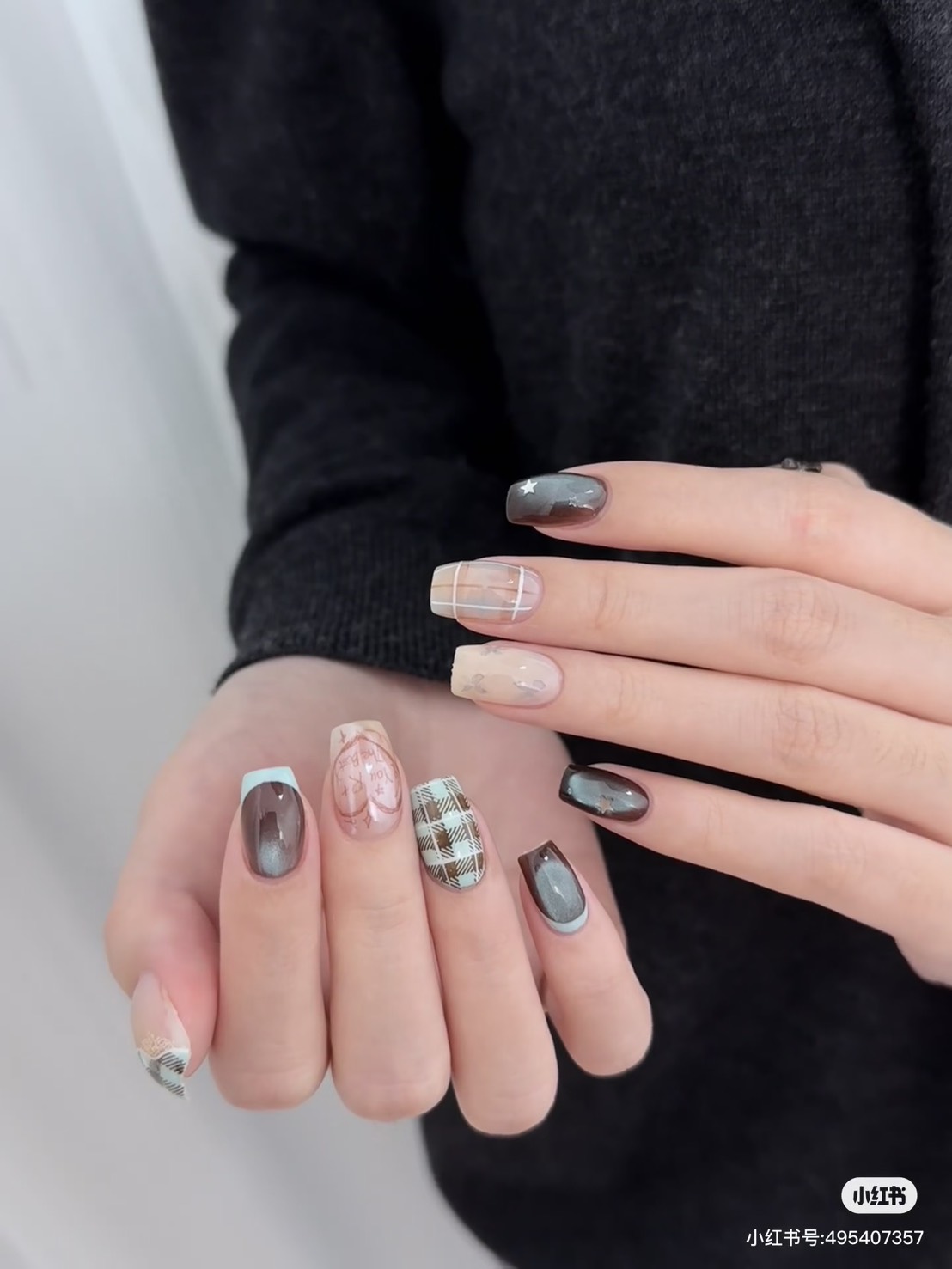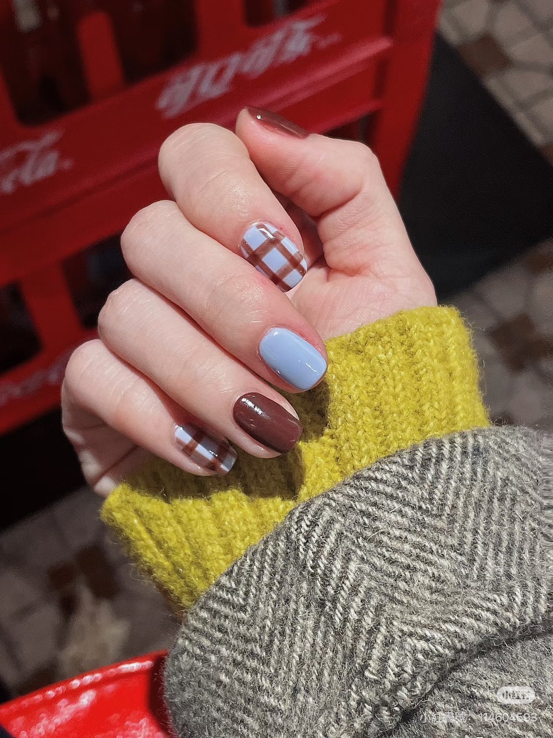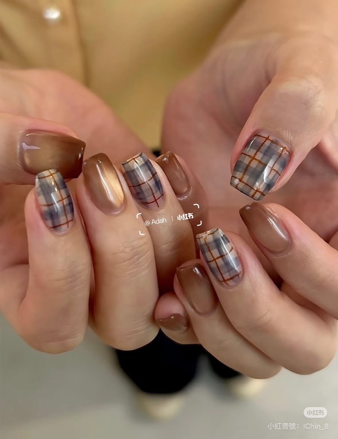 棕色給了我們安定的力量,藍色給了我們遠行的勇氣,人生不該只有一種顏色,它需要棕的厚度,也需要藍的深度,當我們能在繁忙的現實中保持沉著,又能在平凡的日常裡懷抱夢想,那便是最成熟的生活狀態,學會在棕色中腳踏實地,在藍色中仰望星空,讓人生既有溫度,也有思考,換上「藍棕格紋指彩」最終,我們都會在這兩種顏色的交錯中,找到屬於自己的光——不耀眼,卻深遠。